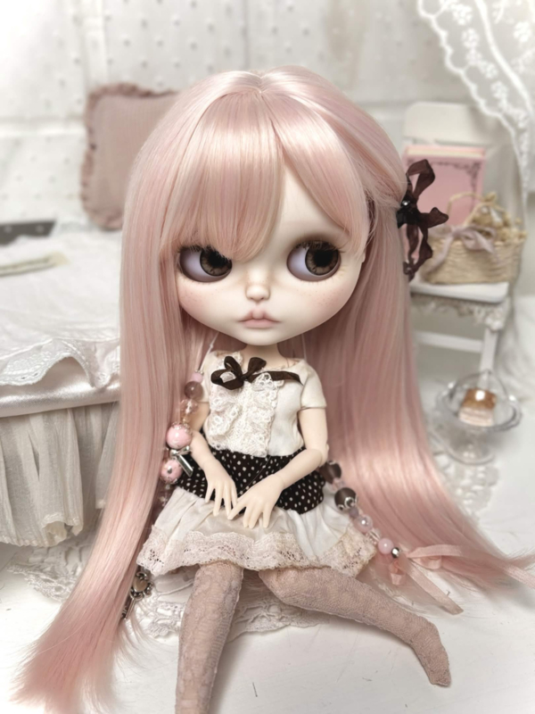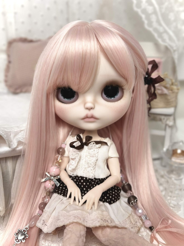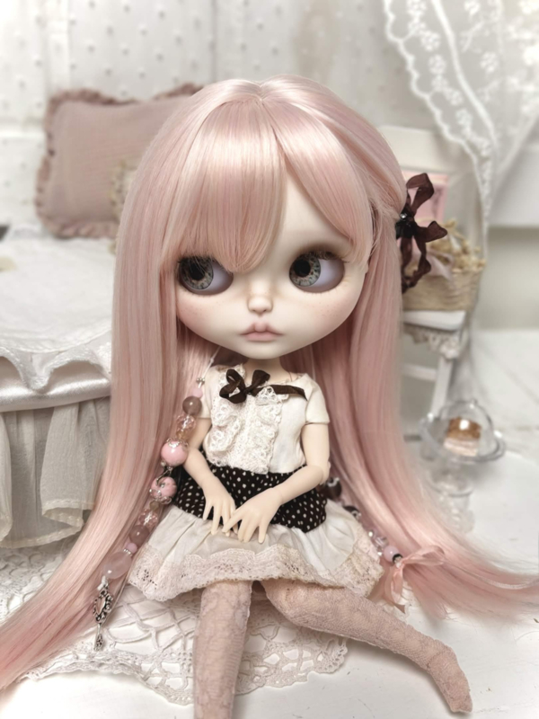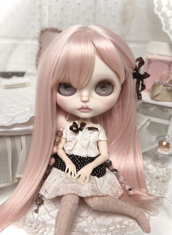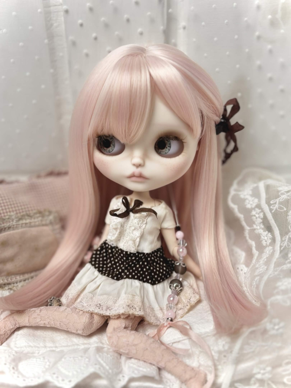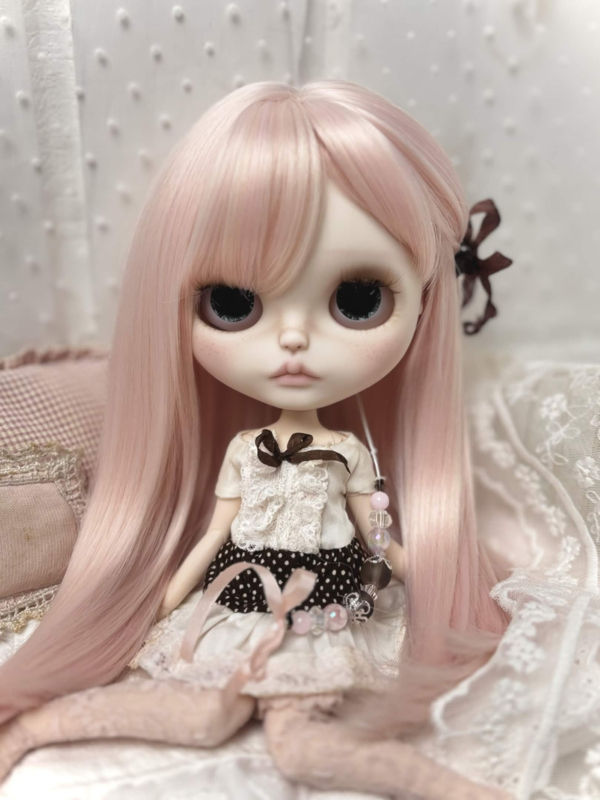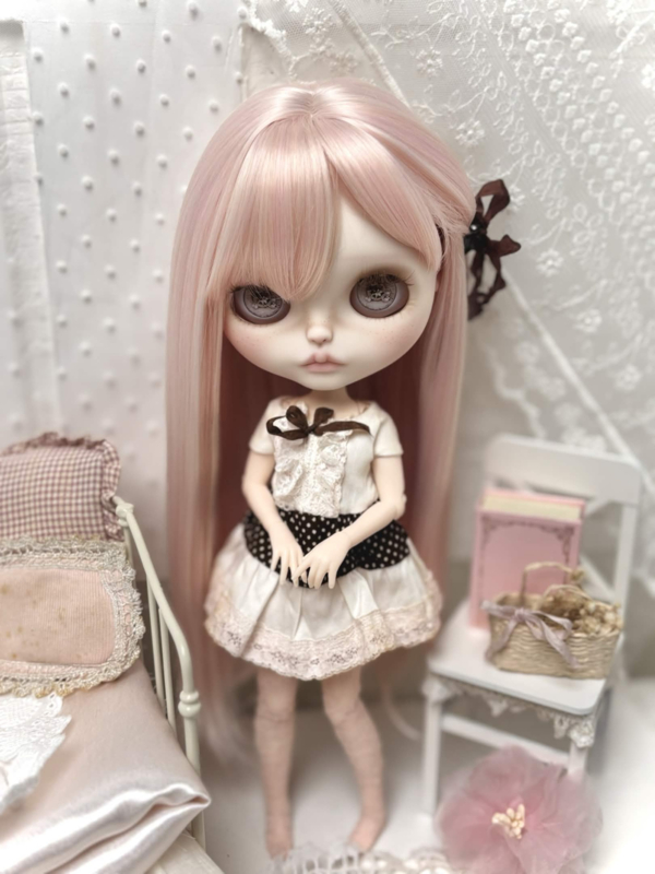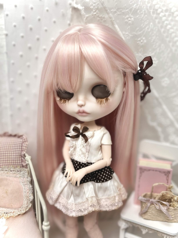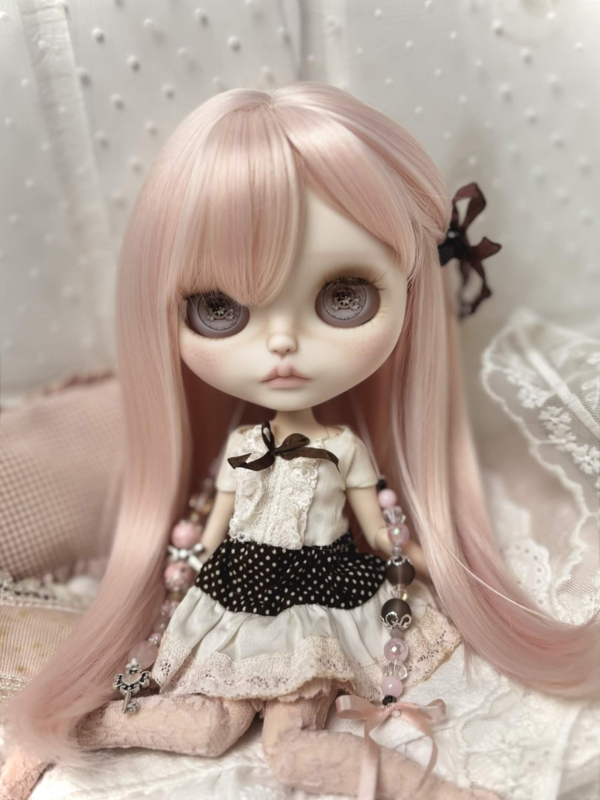 Meet sweet Carmen, my 31th customized Blythe doll! Carmen has long silky pink hair, one side tied with a brown ribbon clip. ୨ৎ She's got four adorable new sets of eyes and deep brown eyelids. Carmen comes with a sweet & playful dress that includes a brown polka dot pattern and layers of pink and white lace! The same brown from her eyelids and dress come back in her pullstrings, together with cream colored beads and soft pink ones. ♥︎ I hope you love her.