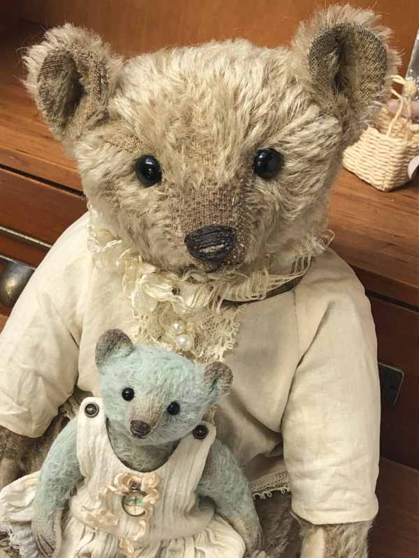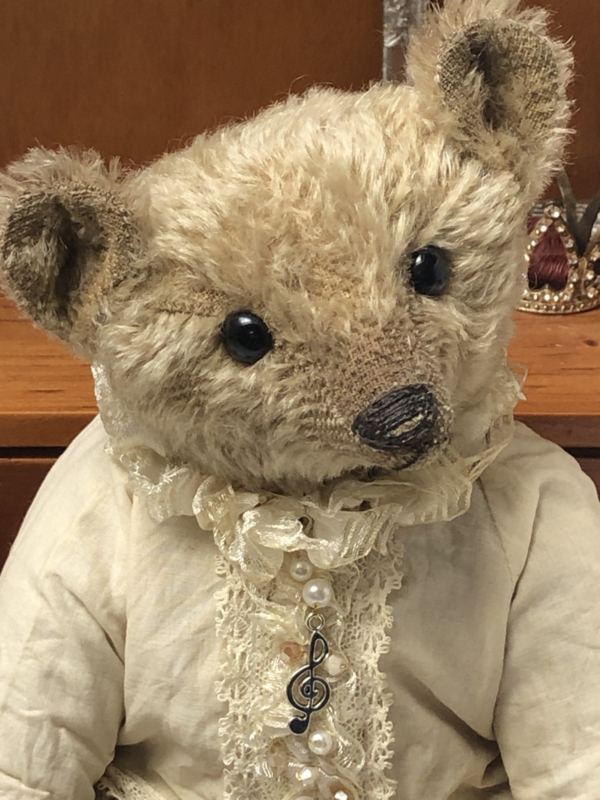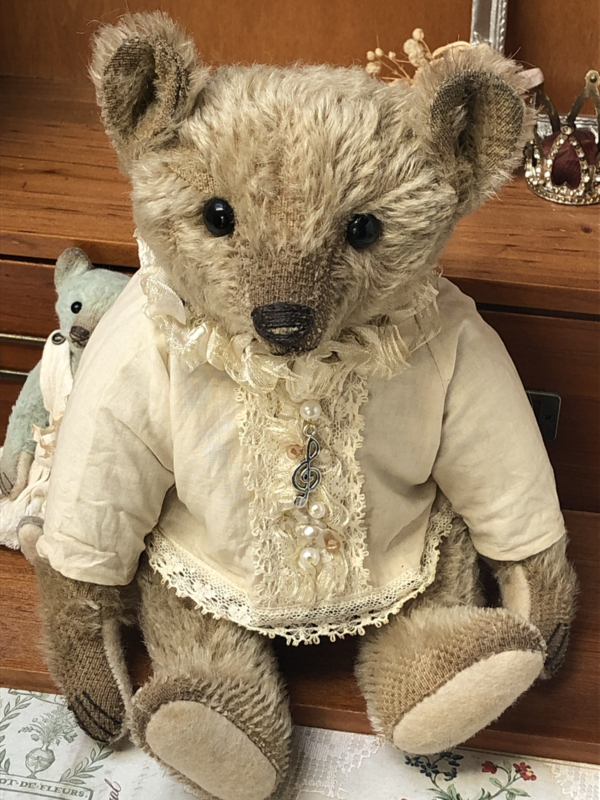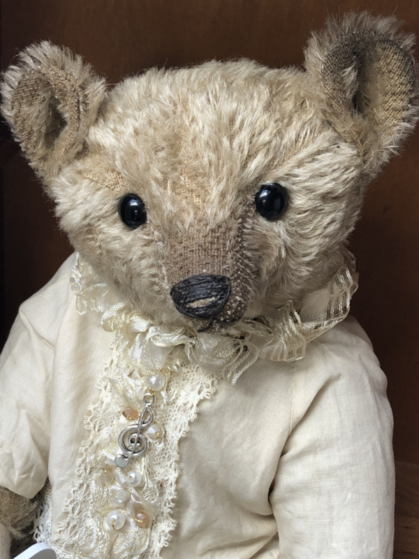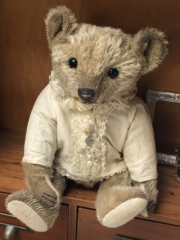My aged furry coat consists of hand dyed mohair fabric, painted on my paws, ears and muzzle and my paws are from thick wool felt. I look quite cuddled and worn and I am in good weight! I have aged black glass eyes and an embroidered nose and claws on my paws.