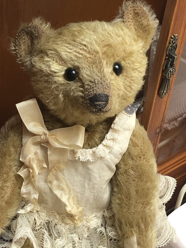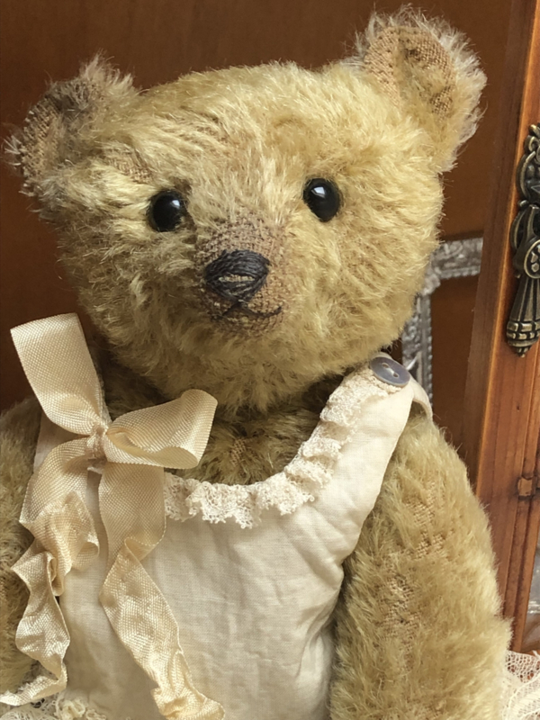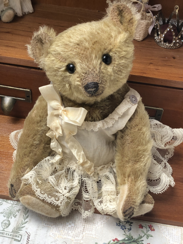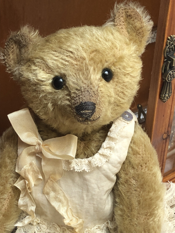 My aged furry coat consists of hand dyed mohair fabric, painted on my paws, ears and muzzle and my paws are from thick wool felt. I look quite cuddled and worn and I am in good weight! I have aged black glass eyes and an embroidered nose and claws on my paws.